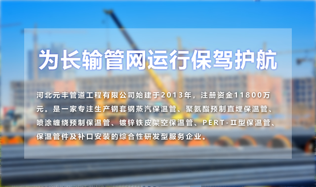 河北元豐管道工程有限公司始建于2013年,注冊資金11800萬元。是一家專注生產鋼套鋼蒸汽保溫管、聚氨酯預制直埋保溫管、噴涂纏繞預制保溫管、鍍鋅鐵皮架空保溫管、PERT-Ⅱ型保溫管、保溫管件及補口安裝的綜合性研發(fā)型服務企業(yè)。